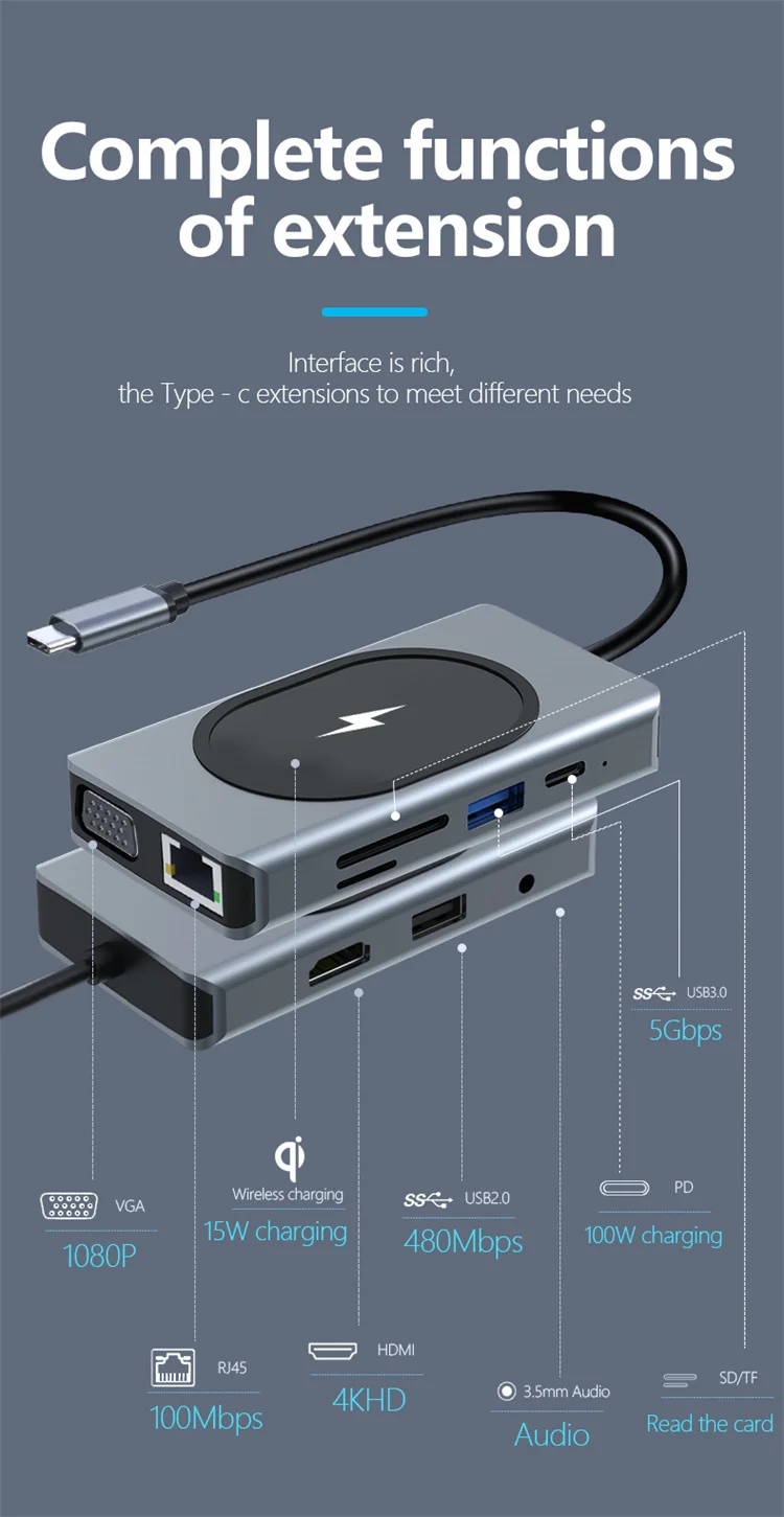 Extension d'interface de chargement multifonction 9-en-1, qui peut répondre à vos besoins d'extension multi-interface, recharge sans fil, adaptation intelligente à la puissance de charge.